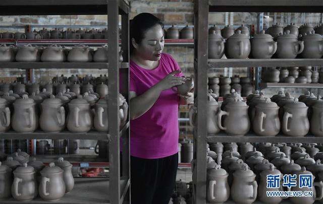 5月21日,郭卉在工作室的生产车间检查刚烧制完成的坭兴陶制品。新华社记者 张爱林摄