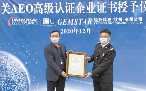 2020年12月25日,钦州高新区骏升科技(钦州)有限公司荣获中国AEO高级认证,成为我市第5个获得该项认证的企业。骏升公司作为我市出口加工型龙头企业,在新冠肺炎疫情的强烈冲击和国际经贸环境不断变化的双重挑战下,依然通过层层评审获得海关AEO高级认证,为我市外贸企业提振了发展信心,为我市加快建成国际门户港提供了有力支撑。