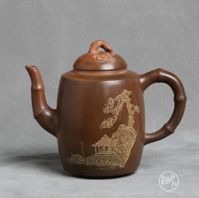 细品此壶,通身褐紫色,陶质细腻均匀,光润莹洁,上手抚之紧致顺滑,绵而不涩,盖身相扣之声如坚石相抵,铿锵清脆,可见董对泥料的炼制非常精到,凸显坭兴陶的材质特色;造型上看,壶身通体圆润丰满,毫无臃肿之感,截盖与壶口轮廓线对接流畅如一体,壶流不是传统取弯做法,而采用直流,流与壶身暗接自然,从根部起至壶嘴,斜插角度挺俏活泼,线条卷杀优美,壶流、壶身、壶把大小比例合谐,特别是壶流取势较高,伸展适度,盖钮不是通常的一粒珠,而取水滴型,提升了壶身的轻盈之感,从视觉上看整个造型,犹如美人娇姿婷立,翘首盼顾,尽得韵致;壶身上取宋人工笔,精细刻绘虬梅一枝,挺拔盛放,施以薄彩,多了几分画外芬芳;茶壶纤手可握,刚刚好,重不压手,刚刚好,出茶汤不急不徐,泡普洱黑茶,刚刚好,壶型和刻写字画内蕴相得益彰,刚刚好。我想,喜欢柔雅情调的品茶人,应该是会对这样一把悦于目、适于心的茶壶动心了吧。